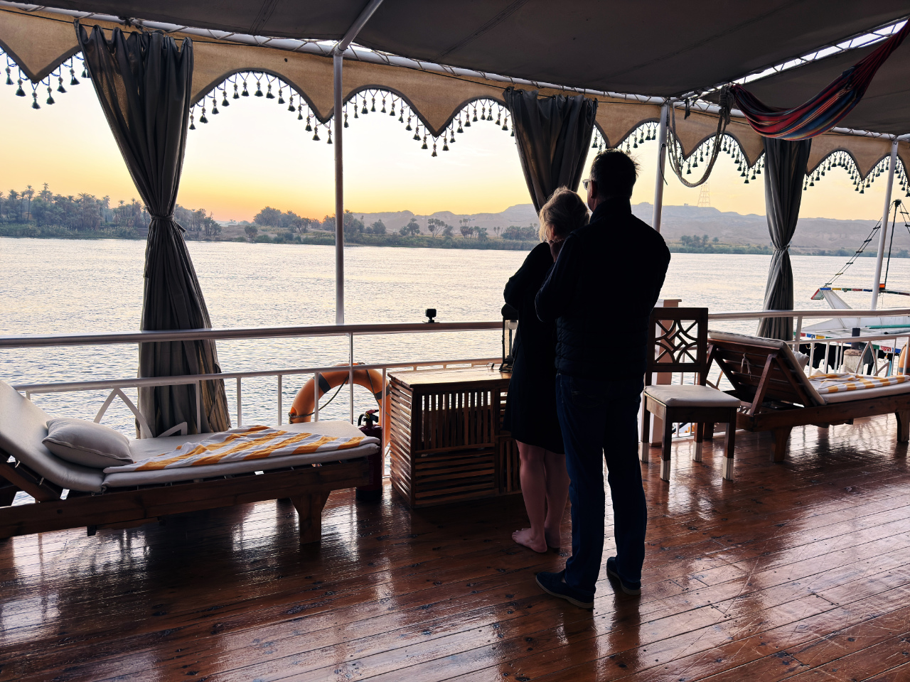 Sie können einen kurzen Spaziergang machen, Ihre Zehen in den Nil tauchen oder sich in den Sand setzen, während die Sonne untergeht. Der Himmel färbt sich rosa, dann bernsteinfarben und schließlich tief mandarinenfarben. Die Vögel kehren in ihre Nester zurück. Die Crew zündet Laternen auf dem Deck an, die ein sanftes Licht auf das Holz und die Segeltücher werfen.