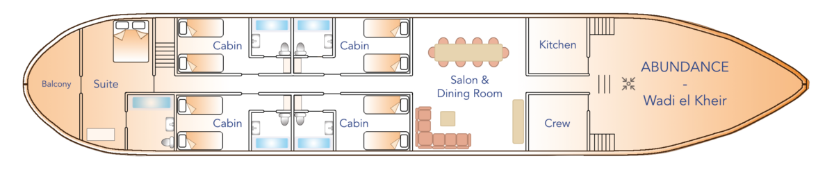 • Die Dahabiya ABUNDANCE kann 10 Gäste in vier klimatisierten Doppelkabinen und einer klimatisierten Suite aufnehmen.
